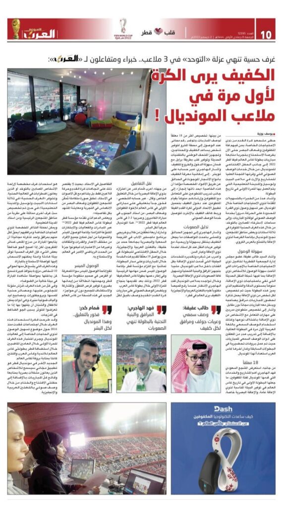 حظي مشجعو كرة القدم من ذوي الاحتياجات الخاصة، بمن فيهم فئة المكفوفين وضعاف البصر حتى الآن بفرصة الاستمتاع بتجربة متابعة مباريات بطولة كأس العالم فيفا قطر 2022 إلى جانب الحفل الافتتاحي للمونديال، من خلال خدمات الوصف الصوتي التي وفرتها اللجنة العليا للمشاريع والإرث في ملاعب البيت ولوسيل والمدينة التعليمية، التي يتم العمل بها للمرة الأولى في تاريخ البطولة.
