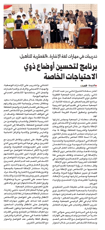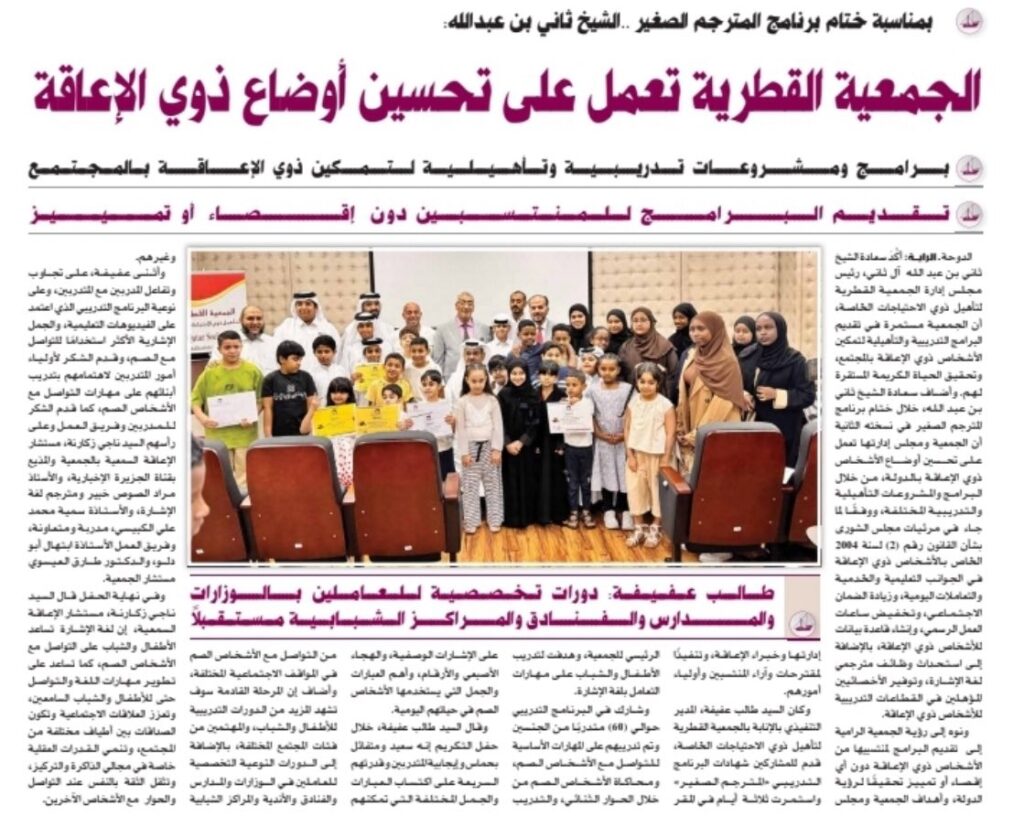 وكان السيد طالب عفيفة، المدير التنفيذي بالإنابة بالجمعية القطرية لتأهيل ذوي الاحتياجات الخاصة، قدم للمشاركين شهادات البرنامج التدريبي “المترجم الصغير ” و استمرت ثلاثة أيام في المقر الرئيسي للجمعية، وهدفت تدريب الأطفال والشباب على مهارات التعامل بلغة الإشارة.