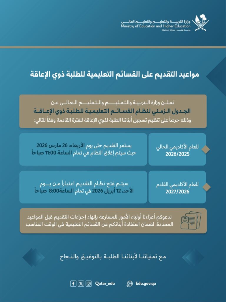 وأكدت وزارة التربية والتعليم والتعليم العالي أن هذا الإجراء يأتي ضمن حرصها على دعم الطلبة ذوي الإعاقة، وضمان استقرار مسيرتهم التعليمية واستمرارية حصولهم على الخدمات التعليمية دون تأخير، داعيةً أولياء الأمور إلى الالتزام بالمواعيد المُعلنة واستكمال الطلبات في الوقت المحدد.
